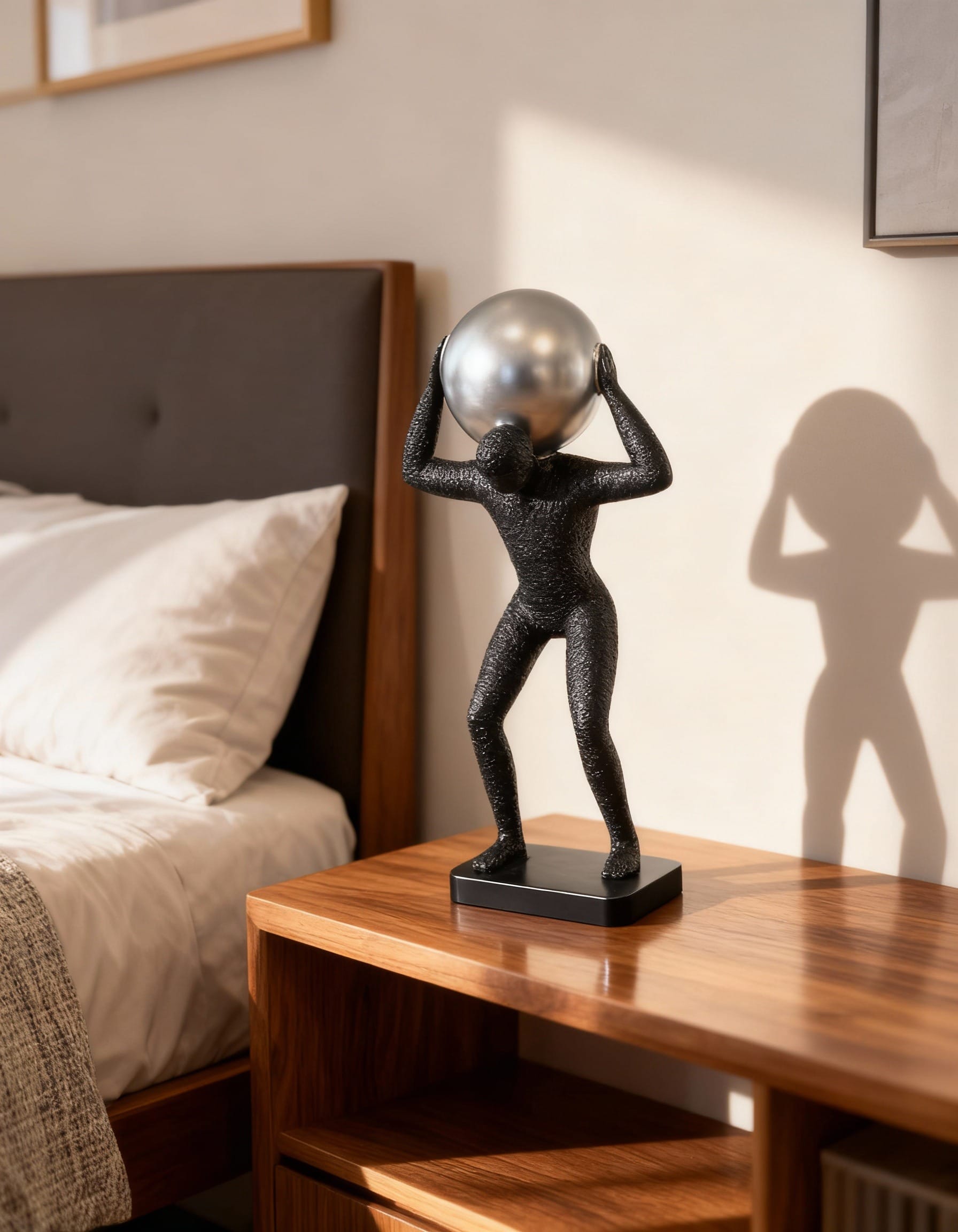 This is a black Atlas sculpture showpiece with a silver ball